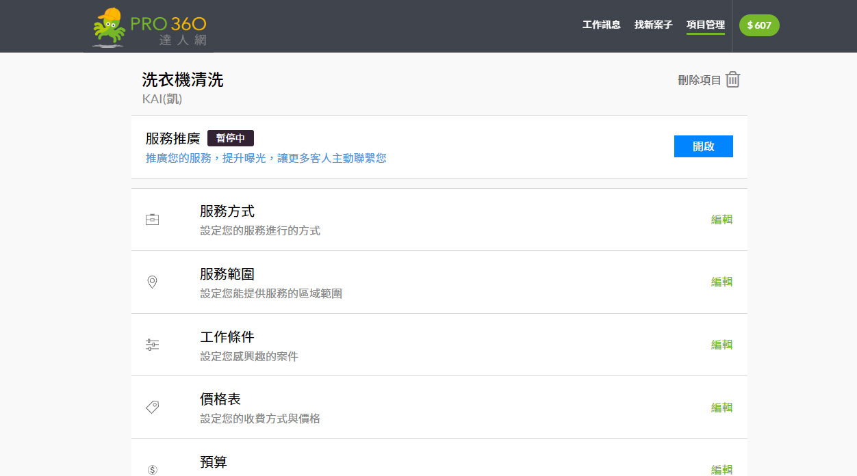 正確的設定【工作條件】【價格表】、【預算】等個別相關的服務條件,會更有利於系統為您配對更精準案件。即使在服務推廣期間,您都可以在本區隨時調整或暫停相關設定。