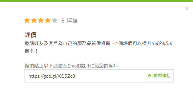 請在【服務管理】裡的【服務評價】中按下編輯,並將畫面中的連結提供給對方,請對方在所屬的頁面中完成填寫,即可立即為你累積評價。