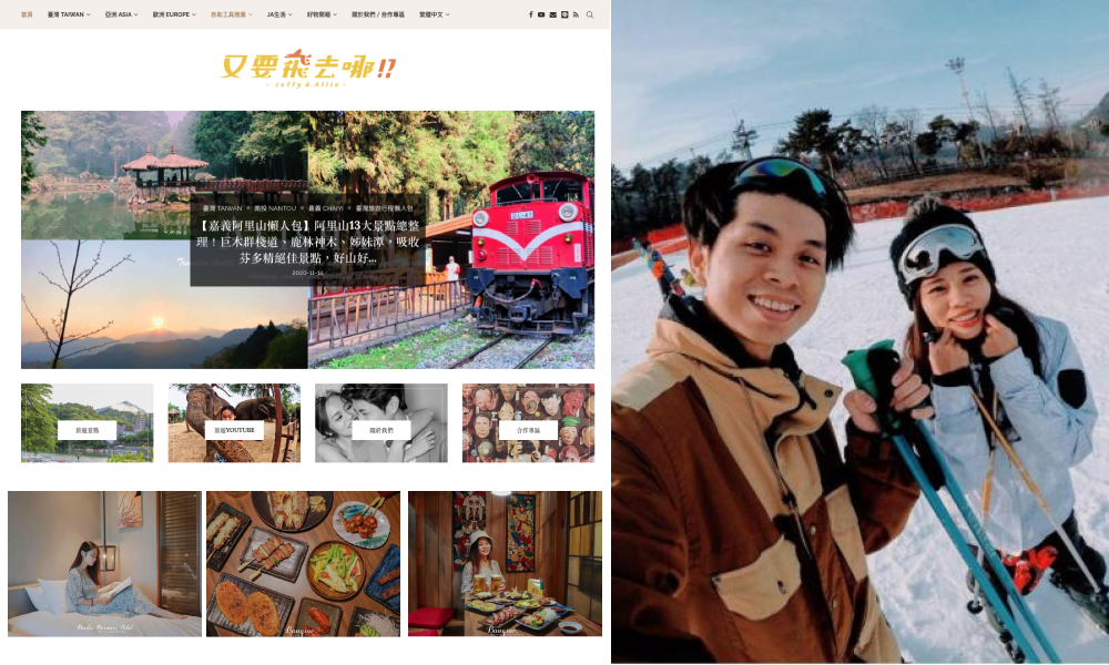 「又要飛去哪!?」的Jeffy與Allie認為旅遊、飲食體驗都是生命中最重要的一環,也藉由記錄生活的方式將這些生活點滴記錄下來,除了曾有多間品牌合作邀約,也是欣傳媒、食尚玩家的駐站部落客,還曾與台中農會、台灣林務局、台北市公用頻道...等政府單位合作。