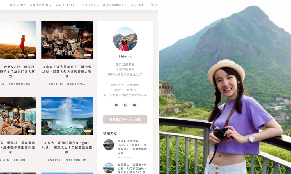 軒寧 Shining經營個人部落格,擅長撰寫國內外各式旅遊攻略與體驗文章、美食評論文章,提供讀者更多選擇,部落格目前累積人氣近 40 萬。曾任台灣最大旅遊平台 KKday 產品開發師一職,擅長洞察市場現況,發掘產品亮點,撰寫具吸引力的商品文案。