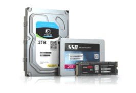 負責寫入電腦資料及讀取,分為傳統硬碟 HDD 與固態硬碟 SSD,傳統硬碟因為發展時間較長,因此技術成熟,且價格較固態硬碟低,可儲存空間也較多,但讀寫資料速度較慢、零件較脆弱、較耗能,重量也比較重;固態硬碟則是新技術,資料讀寫的速度較快也較即時,耗損也較低,但相對的價格較高,容量發展也還不及傳統硬碟。但如果預算方面還充足,可以選購固態硬碟,並且搭配傳統硬碟使用,以提升電腦效能。