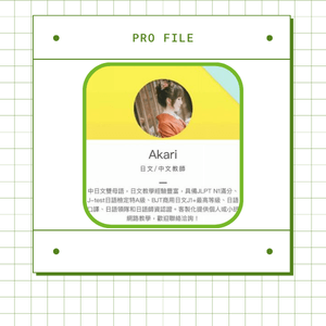 擁有2年日本留學經驗,並與公益財團法人日本台灣交流協會合作,成為日本國際教育協会JLPT講師,提供各式各樣的豐富教材,例如:情境式主題口說英日文學習App、JLPT講師製作的日文核心文法講義...等,提供學生獨一無二的高品質教學體驗。