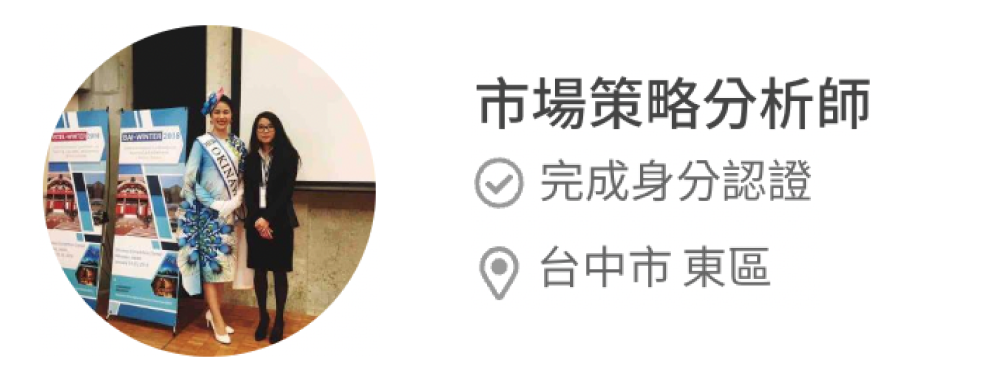 《市場分析顧問服務》Janice於業界擔任市場分析師多年,擅長產品聚焦選品與定價和銷量潛力分析,曾經手的領域包含:餐飲、食品、食品包材、相機包、包包以及機械、工業市場、寵物市場...等。