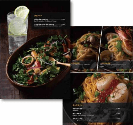 如果您的餐廳所販賣的產品為精緻的餐點,可以參考下面的菜單設計樣式,以精美的餐點實照吸引顧客消費。