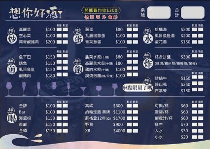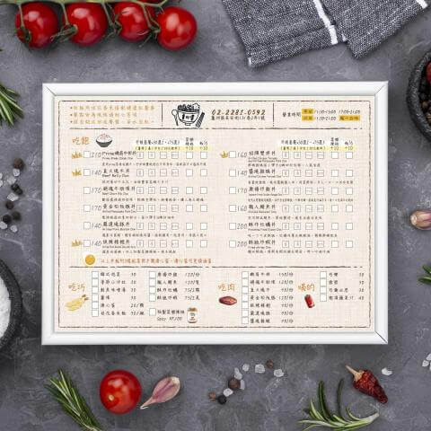 點餐菜單的應用,例如:早餐菜單或是一般小吃菜單,品項繁多的餐廳建議可以使用點菜單,除了方便客人點餐也可以輕鬆與客人核對餐點,建議在設計時可以與設計師討論呈現的方式,也可以請設計師將重複利用納入考量,設計方便畫記、好擦拭的格子大小。