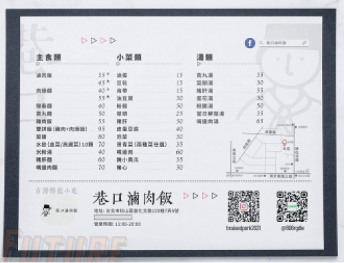 除了餐點名稱、價格,依餐廳性質還可能有不同需求,例如:店名、店家資訊、店家規定或是餐點介紹...等內容,菜單上的資訊繁多,需要斟酌菜單排版方式,讓整體菜單以清楚、明瞭為主。