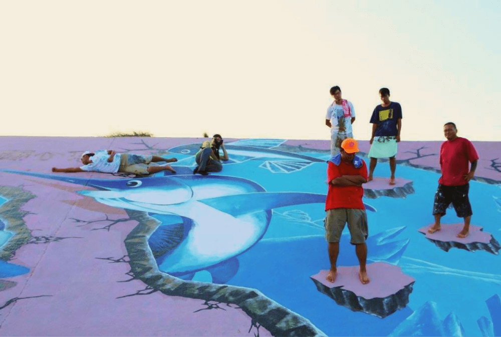 戶外地板的手工彩繪作品大多是3D地景彩繪,以視覺設計營造3D互動壁畫的效果,讓人有懸空、浮於水面、站在懸崖...等視覺錯覺的效果,地板的彩繪藝術可以提供路過的遊客拍照打卡,成為縣市觀光新景點。