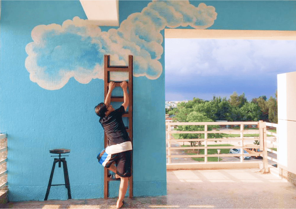 眾籴靣工作室巧妙利用牆面右側的開放式空間感,塑造室內的天空,並繪畫椅子、木梯讓民眾可以與牆面互動,拍攝有趣的照片打卡上傳。