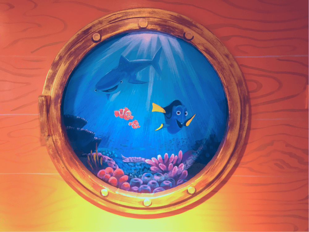 王先生將潛水艇內的窗戶畫得惟妙惟肖,並繪製知名動畫中的多利魚、小丑魚與鯊魚等角色,營造「裡」與「外」的氛圍,讓欣賞壁畫的人有與畫中魚兒互動的感覺。