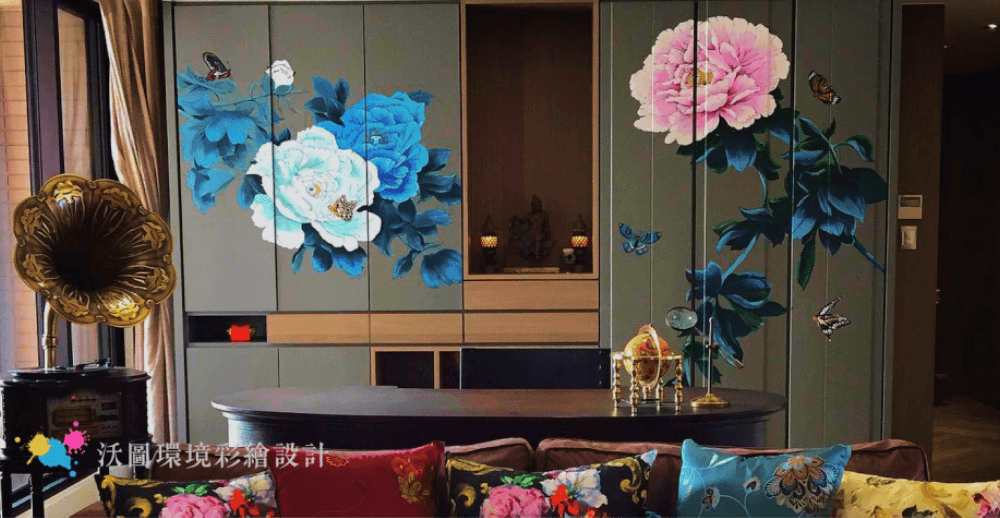 胡永煒為喜愛牡丹花的屋主繪製了大面客廳牆面彩繪,與屋主沙發上的牡丹花面抱枕互相映襯,屋內充滿房屋主人的個人特色。