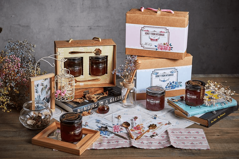 ZhiChi Design為蜂蜜品牌設計的禮盒包裝,客戶訴求古雅高級,用華麗花卉圖樣帶出精緻的品牌形象,因此設計師選用典雅的淡色系為主要設計配色,將品牌Logo置中並以精緻的花卉圖樣點綴,內部則採用奢華的金色底襯托禮盒內的小湯匙與蜂蜜罐。