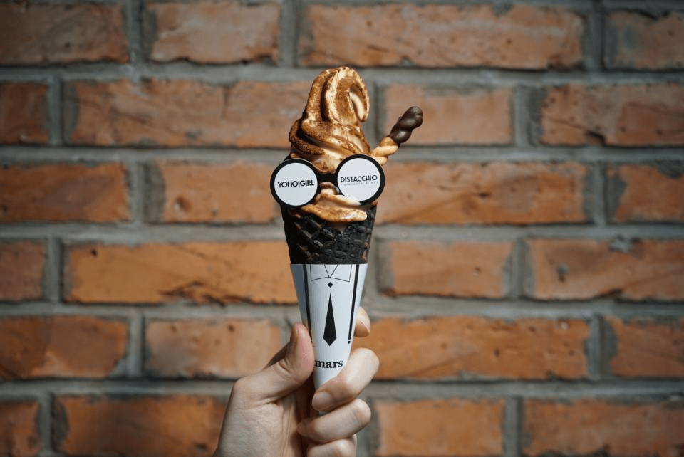 設計師葉凡為甜筒霜淇淋設計的包裝,以眼鏡插卡、西裝造型的甜筒紙將霜淇淋包裝為一名紳士,設計創意有趣,為一款符合濃厚可可口味霜淇淋的包裝,透過這類造型包裝能讓消費者拍下美照上傳社群,間接為店家曝光宣傳。