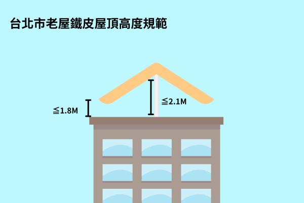 以台北市為例,根據【臺北市免辦建築執照建築物或雜項工作物處理原則】第二點第十三款:7樓以下且已建成超過20年的老舊公寓,經專業人士鑑定有漏水情形,就可以申請建造鐵皮屋,但四周不能加設壁體或門窗,高度從屋頂平台面起算,屋脊不得超過2.1公尺,屋簷不得超過1.8公尺或「原核准使用執照圖樣女兒牆高度」+「斜屋頂面厚度」。