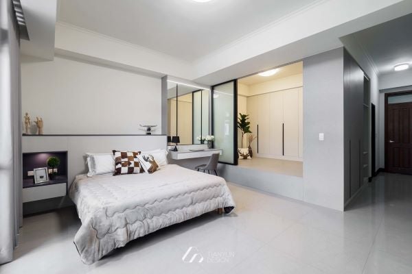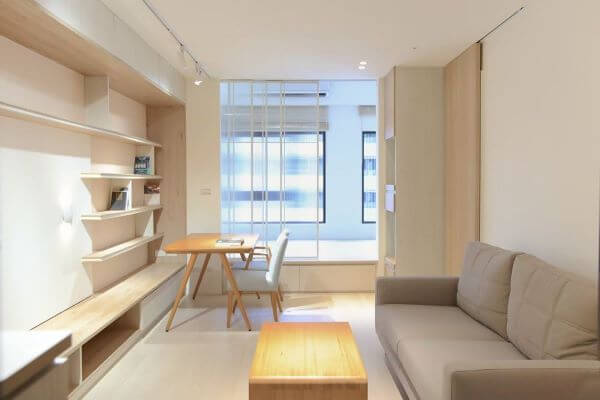 在空間有限的小宅中最忌封閉隔間,受限且零碎分割的格局,容易造成視覺及光線受到阻礙,因此開放式設計一直是小坪數設計的首選,在設計和室時,可以跳脫和室需搭配紙拉門的刻板印象,採用開放式設計讓空間感放大,擺脫小宅狹窄壓迫的視覺感受,若仍需要區隔出獨立的空間,可以採用玻璃拉門取代實體隔間,在區隔空間同時又不失採光。