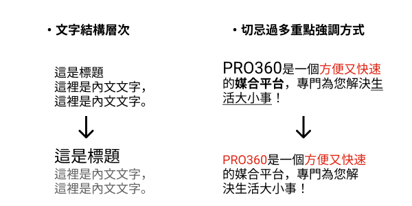 主要標題與內容文字要有明顯的區隔,並在整體版面中使用統一的形式以創造規律,讓人容易區分標題與內文。另外,在同樣的文章段落中要避免使用過多形式的重點強調方式,例如:切忌同時使用底線、加大字體、加粗字體以及選用不同文字顏色或底色等方式強調重點。