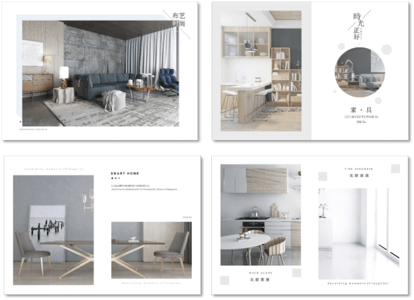 圖文排版要思考整體的圖片、文字結構佈局。左上圖是以整體客廳風格作為主視覺而置中的版面設計,其餘圖片皆為展現各個居家空間,以左右分為兩區塊的結構佈局。而大量的版面留白也與北歐風格的居家設計恰好相呼應,不僅以精煉的文字與版面展現北歐風格,更以簡約的排版設計吸引喜好簡單、乾淨、寬敞居家空間的消費者。