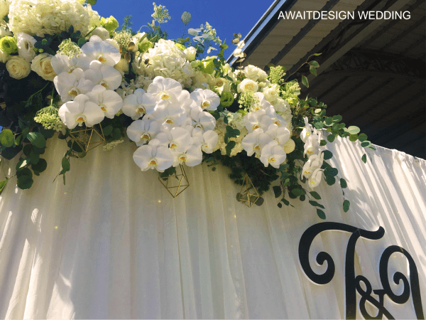 除了大片客製化的背板外,婚禮背板佈置往往還會利用漂亮的燈光,以及精緻的造景營造佈置品,例如:花架、花卉來裝飾舞台,價格相較花藝佈置更低,但卻有不輸給花藝佈置的質感,亦是許多新人的熱門選擇。