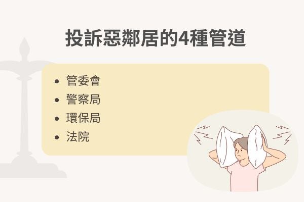 若您不幸因鄰居的行為或噪音產生爭執,除了試著與鄰居溝通,請鄰居停止擾鄰行為,也應搜集相關證據,當鄰居不願意改善行為,便可向管委會、警局、環保局或法院提出申訴,以下將為您詳細說明投訴惡鄰居的4個法律途徑:
