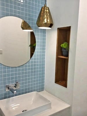 側牆式壁龕經常設置在洗手台旁,不僅能活用畸零空間,避免懸掛收納櫃造成浴室擁擠,還能作為開放式展示層架,擺放美觀的裝飾品與瓶裝的衛浴用品,讓洗臉盆的檯面更整潔。