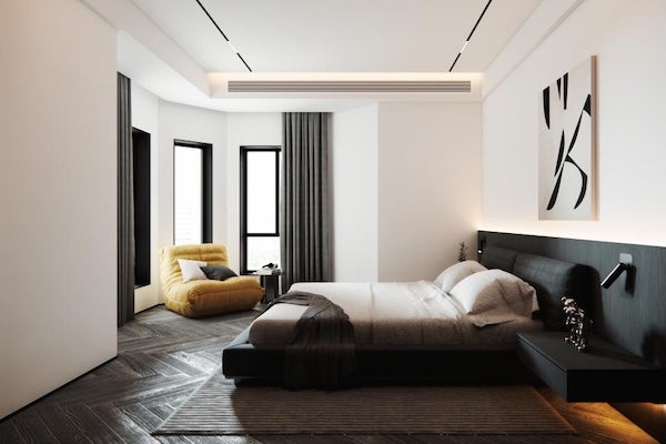 若想強調空間的開闊感,可選擇直接騰出飄窗空間。此案例中房間飄窗區不設臥榻或桌面,而是讓自然光線自由進入,並擺放一張單人沙發與茶几,將原本可能成為畸零角落的飄窗區域,改造為輕鬆舒適的閱讀區域。