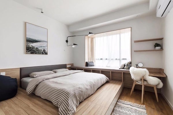 如果家中飄窗只有窗體外凸,可以透過木作方式打造框型窗台。以下案例中,設計師利用實木板材打造框型窗台,窗台底層稍微延伸並凸出牆面,檯面上方鋪設軟墊並放上抱枕打造臥榻區;臥榻下方則規劃成開放式空間,作為高架床台旁的收納空間,搭配簡潔的白色牆面與局部層板設計,使窗台空間具有溫潤自然的風格又不失機能。