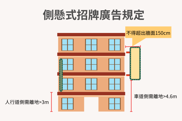 - 側懸式招牌若設置於車道上方,招牌需離地4.6公尺以上;若設置在人行道上方,則需離地3公尺以上。