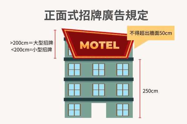 - 正面式招牌不得突出建築物牆面超過50公分,離地高度不得小於250公分。