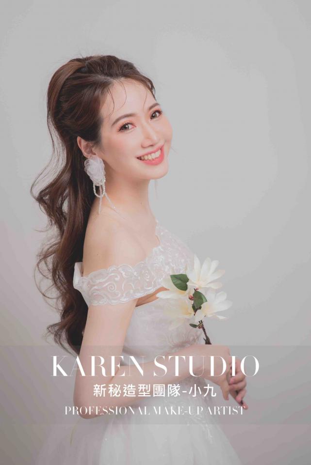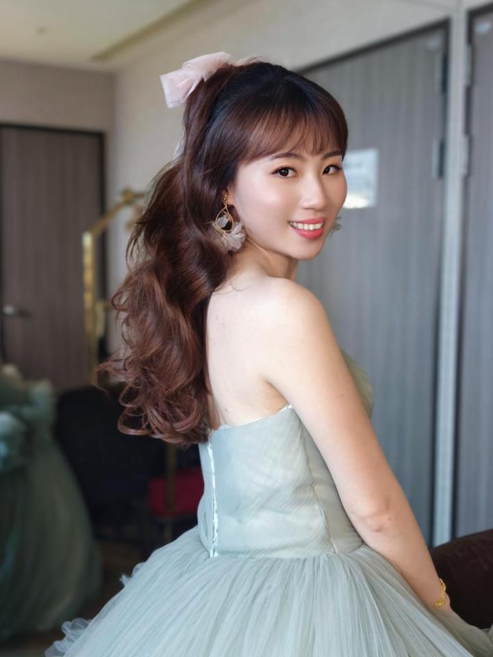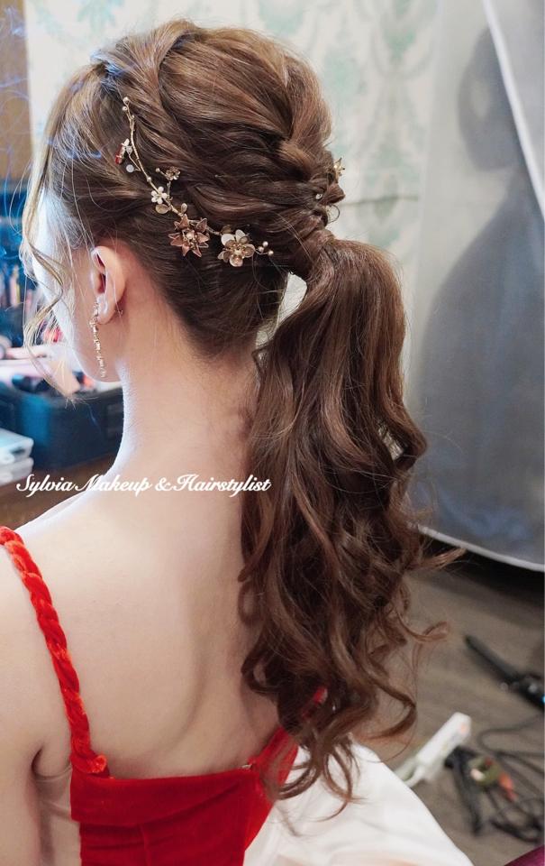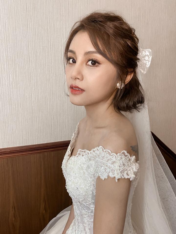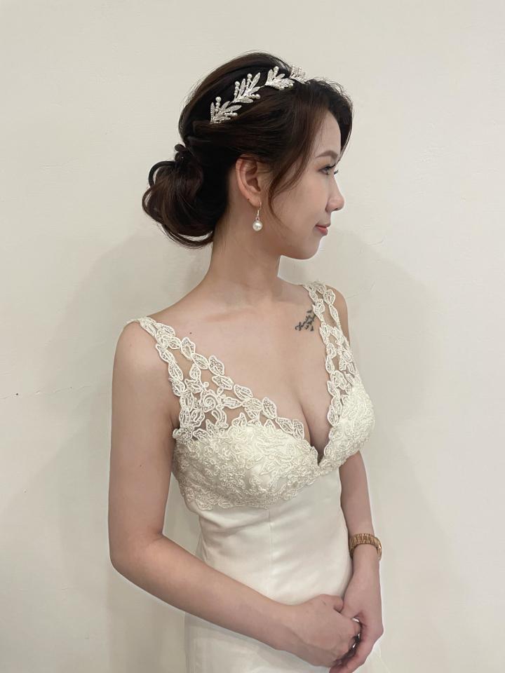 上圖的新娘造型以高馬尾髮型打造俐落清爽的視覺效果,凸顯新娘精緻的臉部線條,馬尾呈現柔和的弧度,自然垂落至肩後,增添浪漫氛圍;髮根部分則稍作蓬鬆處理,使整體造型更具層次感與立體感,完美展現新娘的青春活力與優雅氣質。
