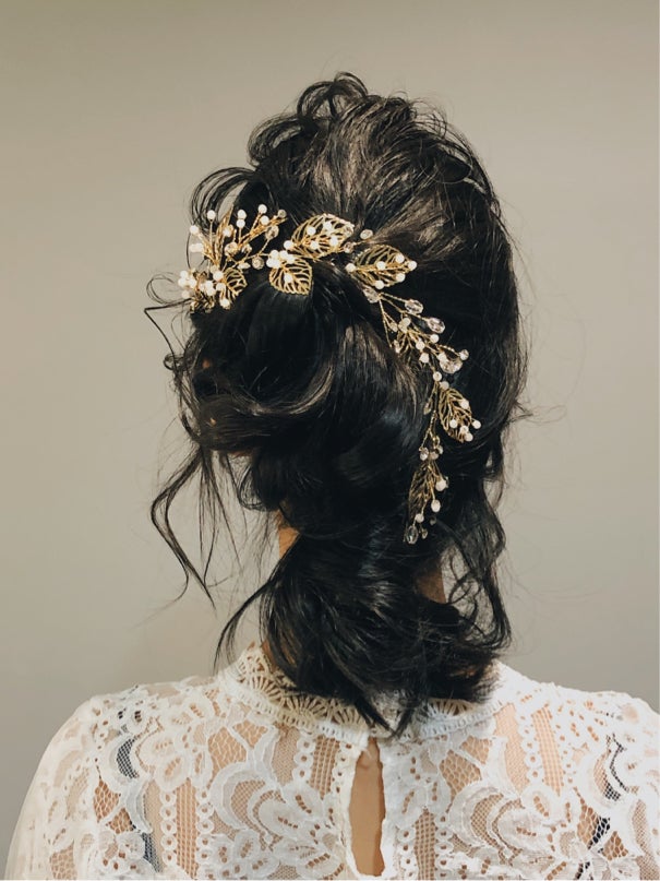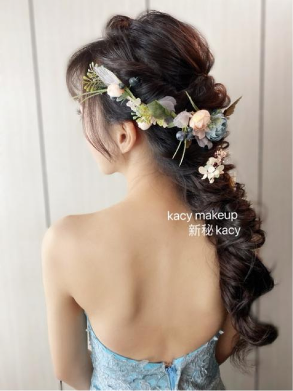 中長髮的新娘建議可以自然捲髮為基底,展現柔美的浪漫氣質,透過自然下垂的捲髮弧度,營造出輕鬆而不失優雅的感覺,襯托新娘獨特的氣質。若擔心簡單的造型過於呆板無聊,則可搭配較顯眼的髮飾,以花卉增添甜美感,讓整體造型更顯自然動人,非常適合戶外婚禮或自然主題婚禮。