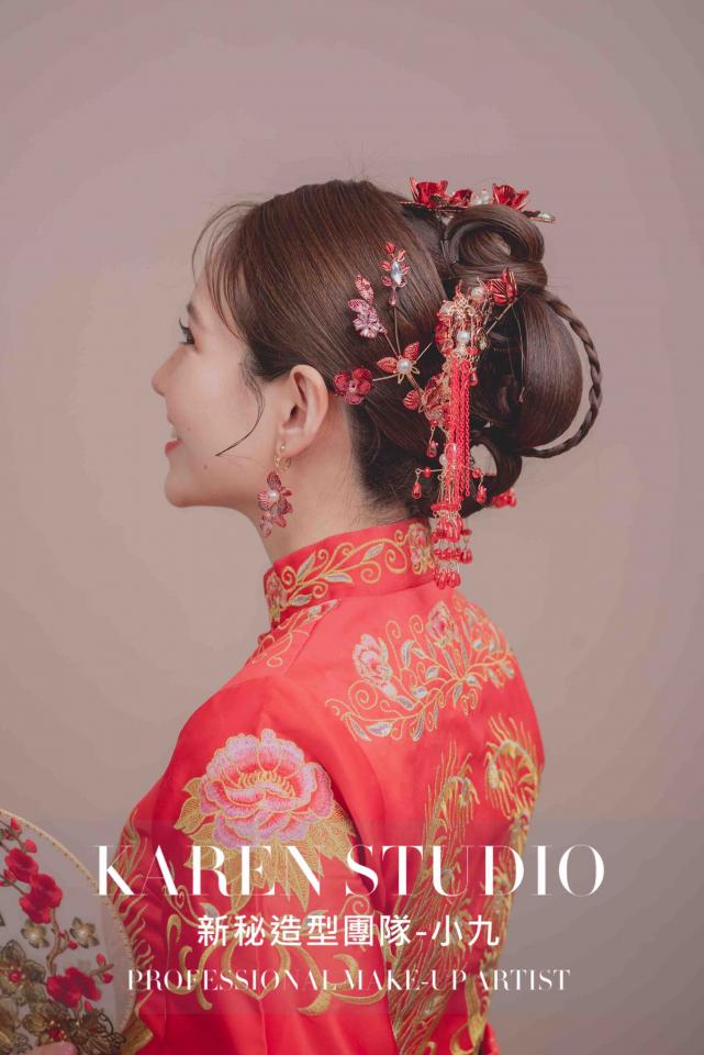 中式造型新娘大多偏好選擇繁複典雅的盤髮,以配合傳統婚禮的華麗與古典氛圍,上圖的盤髮造型將髮絲編織成層次分明且穩固的結構,並搭配紅色流蘇、金屬蝴蝶及花卉元素,與傳統的中式龍鳳褂或秀禾服相得益彰,充滿古典韻味,流蘇設計會隨新娘的行動輕輕搖曳,增添動態的美感,使整體造型更加靈動。