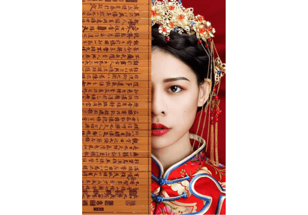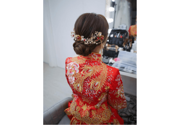 近年來隨著復古風潮的流行,中國風的新娘造型也成為越來越多新娘的婚紗造型選擇,中式婚紗造型跳脫以往傳統的形式,改良成符合現今美學的樣貌。中式新娘妝容的色調大多以紅色系、粉紅色系為主,創造充滿喜氣的風格,眼妝的部分尤其醒目,讓新娘本身不會被搶眼的紅色古典婚紗奪去風采。妝髮造型的部分多以盤髮為主,搭配上髮簪、金飾等頭飾,創造或溫婉或華麗的中國風新娘造型!