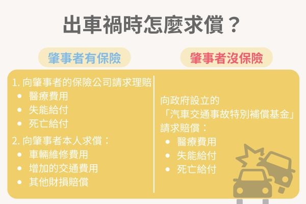 車禍時,受害者除了可以向肇事者請求賠償外,也可以向肇事者投保強制汽車責任險的保險公司請求賠償,但肇事者沒有保汽車責任保險怎麼辦?以下將以有保險與沒有保險的情況,分別為您說明出車禍時該如何求償: