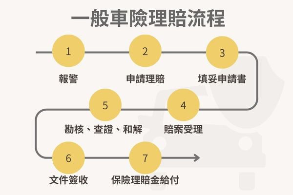 一般車險又稱任意險,任意險指的是車主可自行決定是否投保的保險,其中包含:第三人責任險、車體損失險、竊盜損失險...等,以下為一般車險理賠流程: