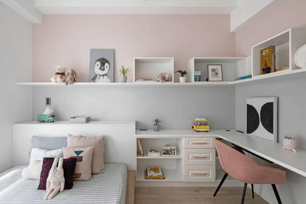 柔和細膩的粉色是近年油漆顏色的主流,尤其是飽和度較低的藕粉色系,搭配灰色能打造清新舒適的空間感;若選擇飽和度較高的粉色,則能搭配木質家具,以及灰色或綠色系的窗簾、床單或抱枕...等物件,營造低調高雅的氛圍。