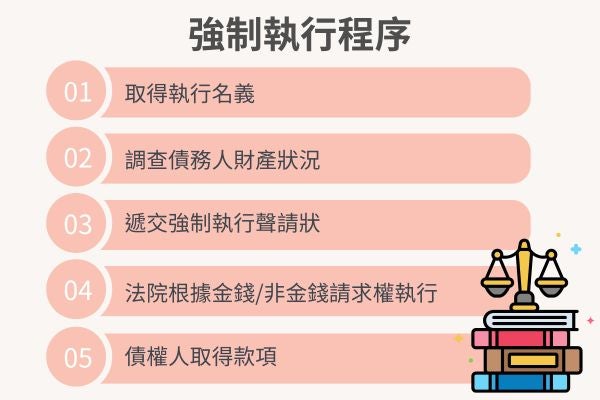 - 強制執行:取得執行名義後,債權人可透過法院強制債務人履行義務的程序。