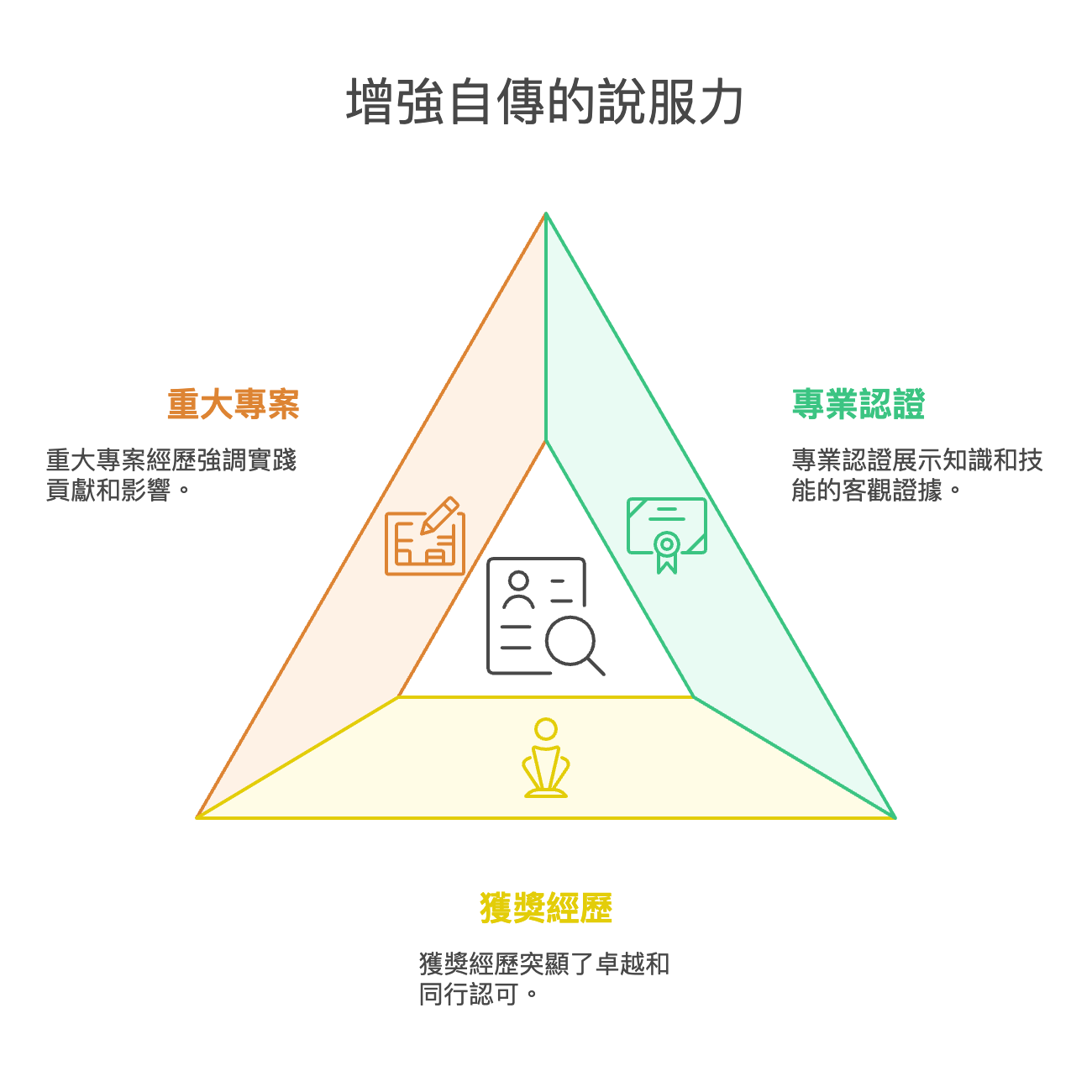 擁有專業認證可客觀呈現您具備的專業能力與知識,請在自傳中列出所有相關的認證與獲獎經歷,以專業認證與獲獎經歷增強自傳的說服力。