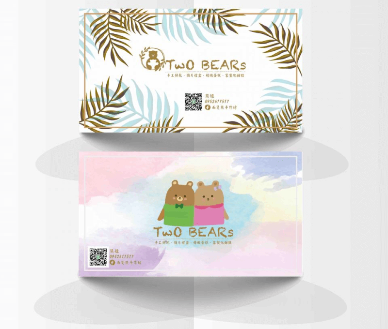 設計說明/ 其中一款以店名做主要設計左側搭配小Logo圖樣,以兩種配色為主塑造質感風;另一款則以小熊Logo做主要設計,以渲染的水彩色作為背景並搭配仿手寫字體