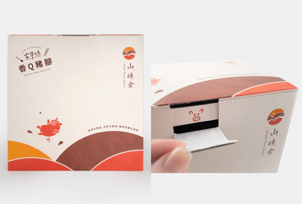 黑圈設計 oran design為良誠事業商行設計豬腳禮盒,搭配品牌簡約的風格,將傳統大紅色、豬腳圖的豬腳禮盒,改為簡約、可愛的小豬圖樣,更在開封處搭配一張可愛的小豬臉,顛覆傳統豬腳禮盒的設計。