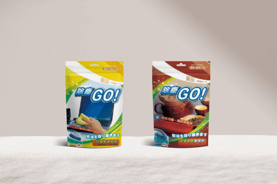 聿設計平台所設計的清潔商品包裝,商品主打除塵、清潔力佳,且體積小巧方便隨身攜帶,故以糖果包裝的小巧夾鏈袋設計,讓消費者可以用完除塵布後放回包裝內,再壓緊夾鏈袋即可,不僅是創意、引人注意的包裝,更有實質上的功用。