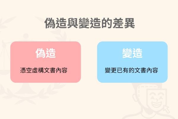 - 變造:指沒有修改權的人,擅自塗改文書上的文字、數字、日期,或增刪部分內容,但並未改變文書的本質,例如:修改借據金額或增減租賃期約內容。