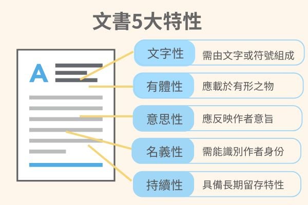 根據刑法規定,並非所有紙本文書都符合「文書」的定義,文書需符合以下5特性: