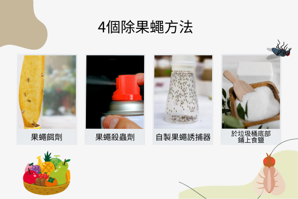如果想要從根本滅除果蠅,可以在垃圾桶底部鋪上食鹽,當果蠅幼蟲從腐敗水果中孵化,就會因為環境鹽分過高,最終脫水而死。果蠅成蟲的平均壽命僅30~60天,此方式能使家中的果蠅數量逐步下降,再搭配其他預防措施,就能輕鬆滅除家中果蠅。