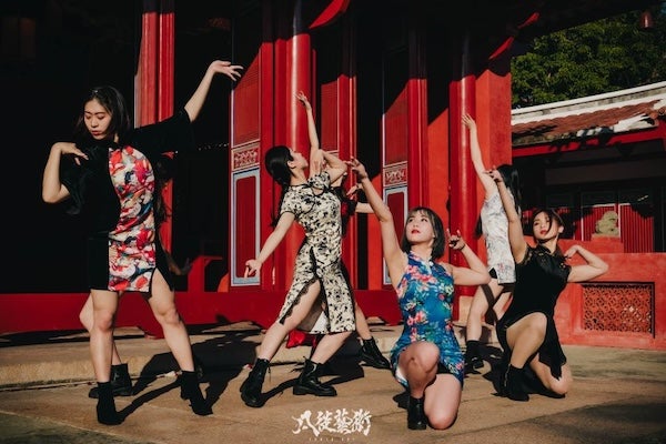 ▲6位女子在傳統建築物前展示優美且有難度的舞蹈動作,營造照片張力。