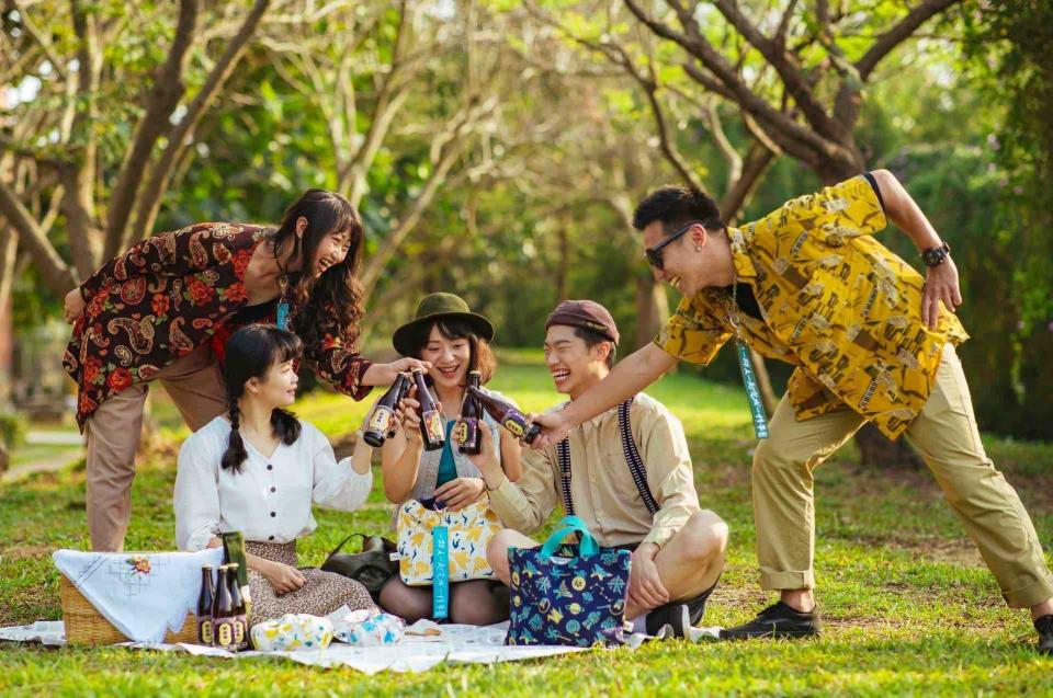 ▲三五好友在公園的草地上或站或坐,手持酒瓶擺出乾杯姿勢,享受野餐的樂趣。