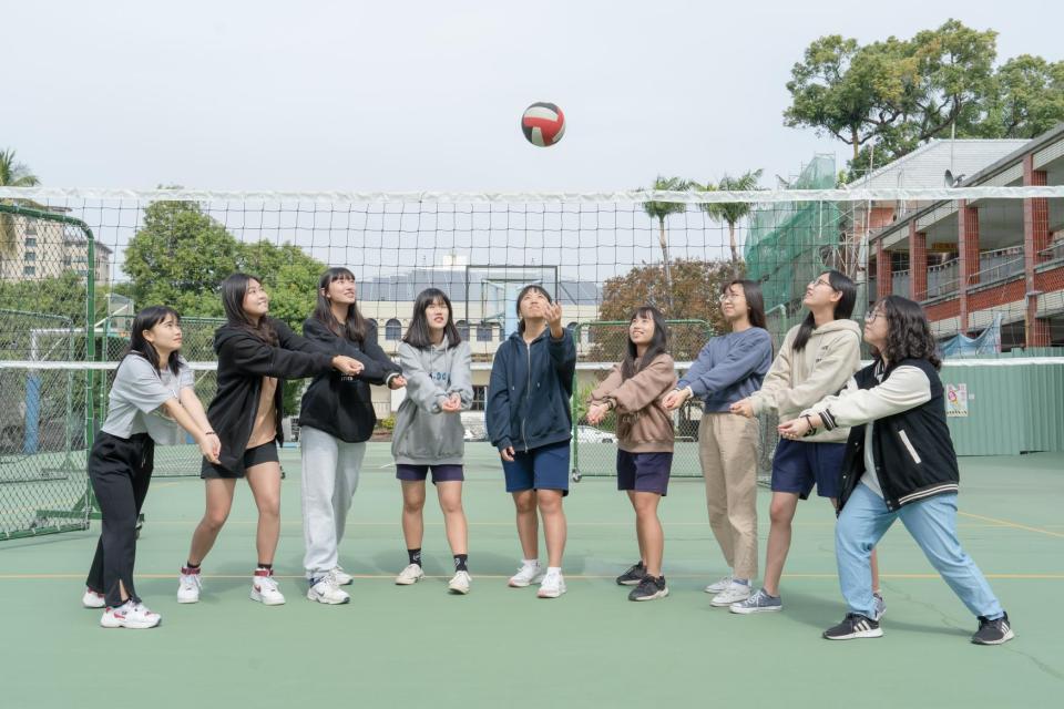 ▲熱愛排球的女孩們眼神專注在排球上,站位呈圓弧型,準備接下這顆球。