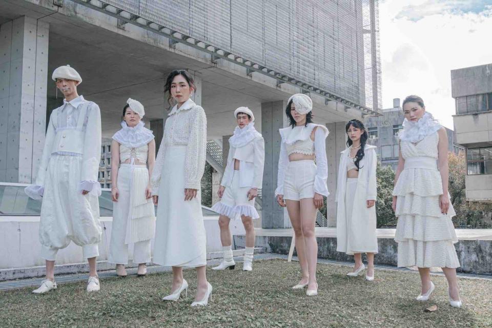 ▲全體模特兒身穿白色服飾造型,站姿、方向與視線一致朝向前方。