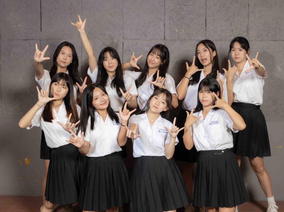 ▲9位女學生一起比出IG流行手勢,展現活力青春。
