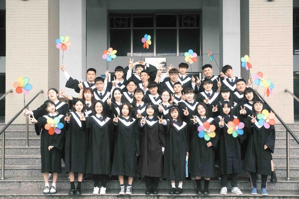▲整齊排列的畢業生們身穿黑色學士服,手比V手勢,角度整齊劃一。