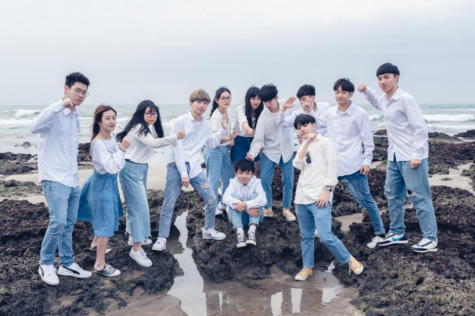 ▲青春男女們穿著白色和牛仔藍的服裝,與海岸背景形成和諧的照片。
