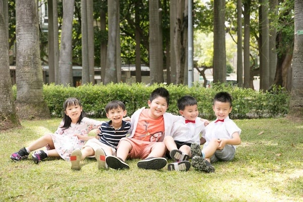 ▲笑容滿面的小朋友互相搭肩坐在草地上,和樂融融。